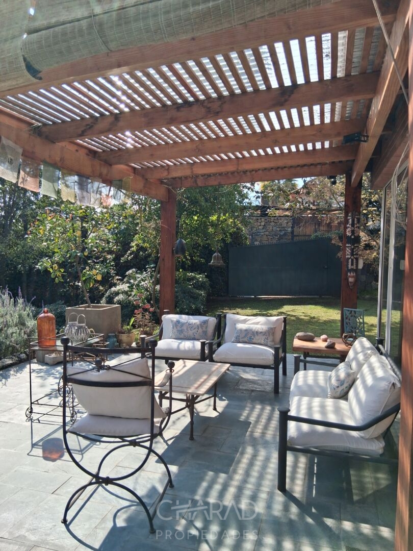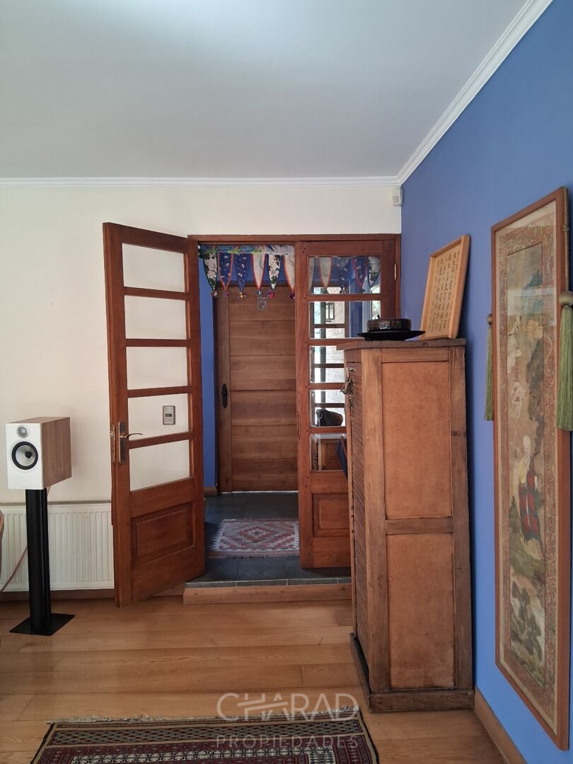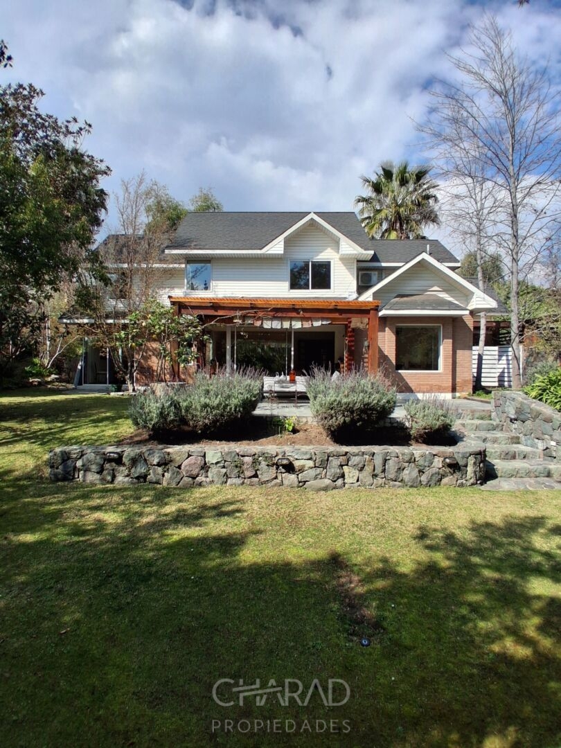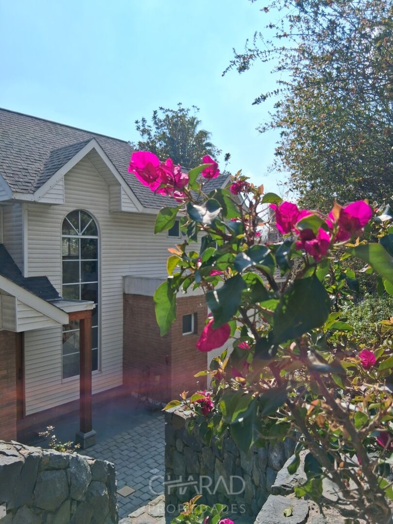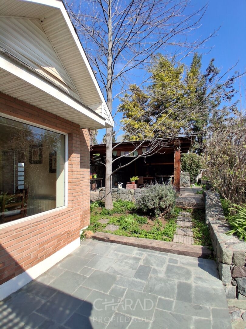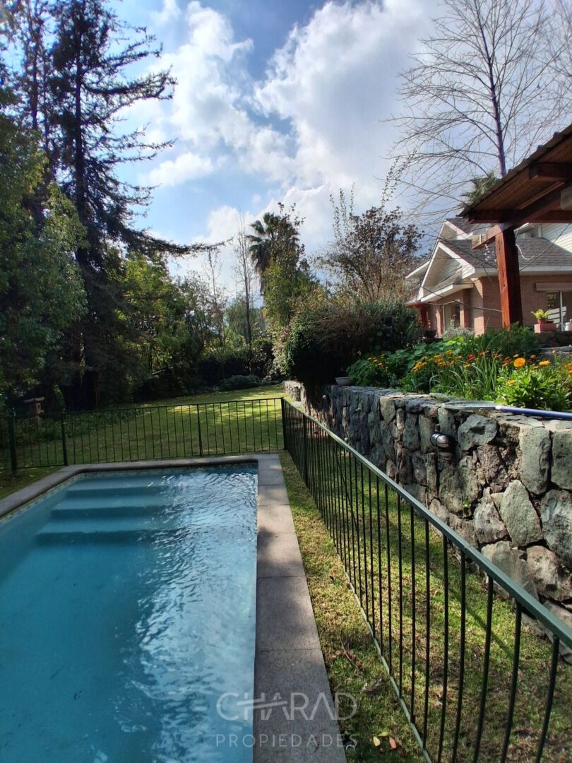 Exterior: Jardín formado, riego automático, terraza, quincho techado, bodega, piscina, huerta, estacionamientos.