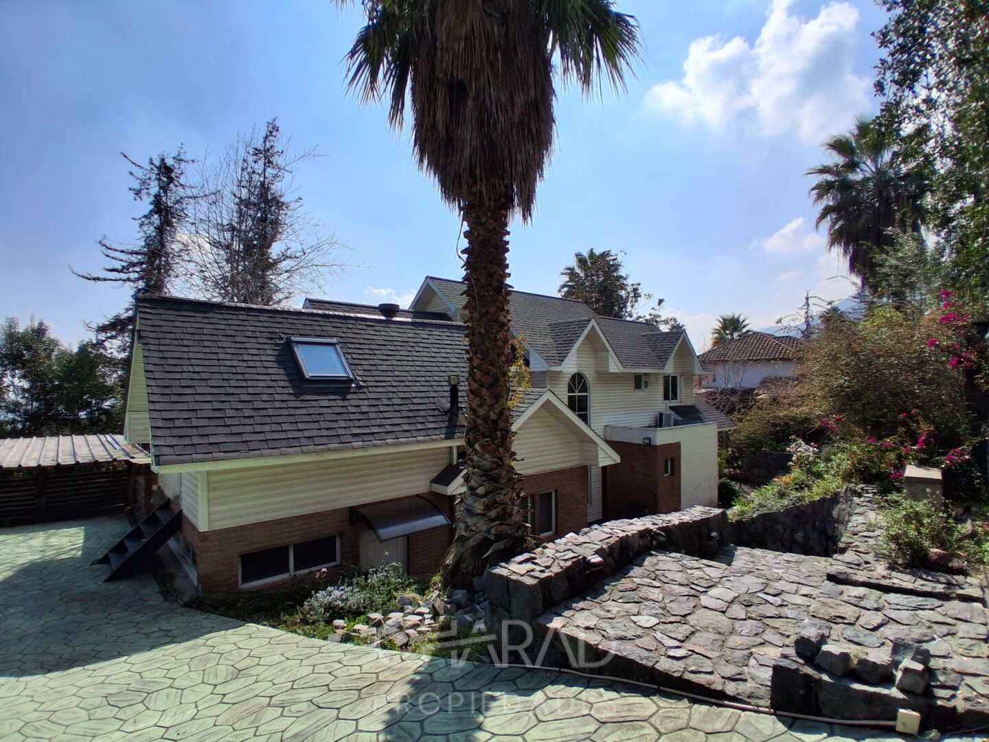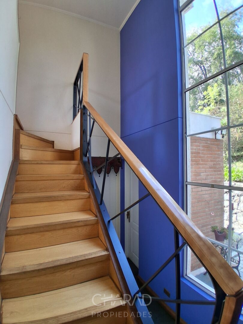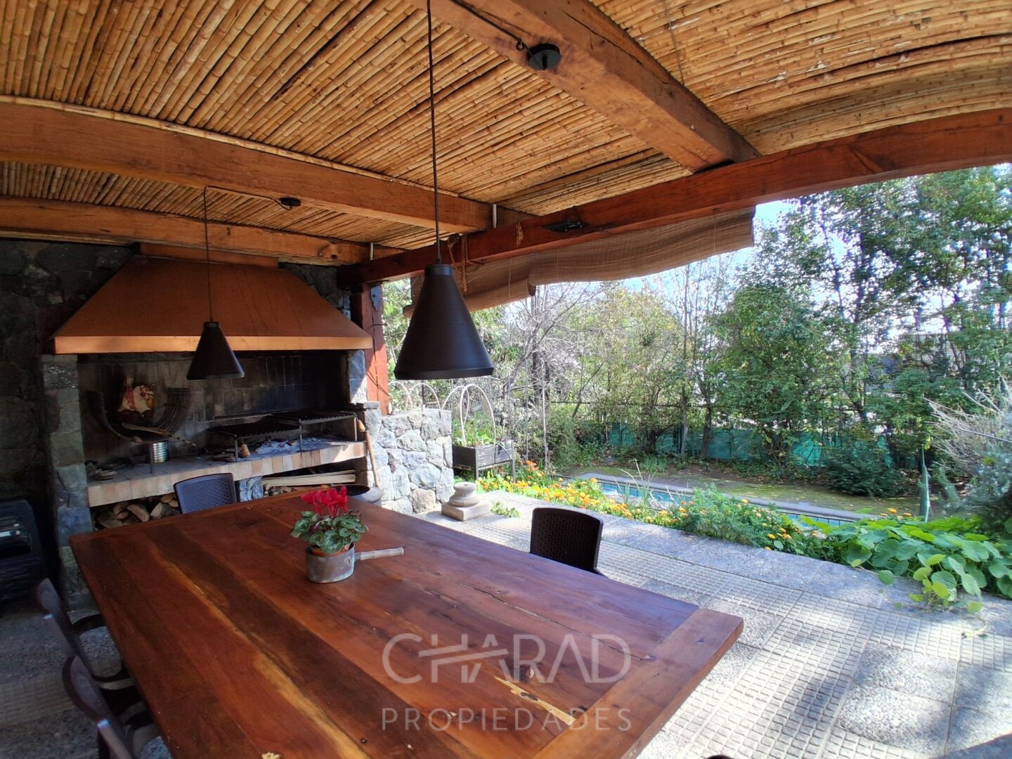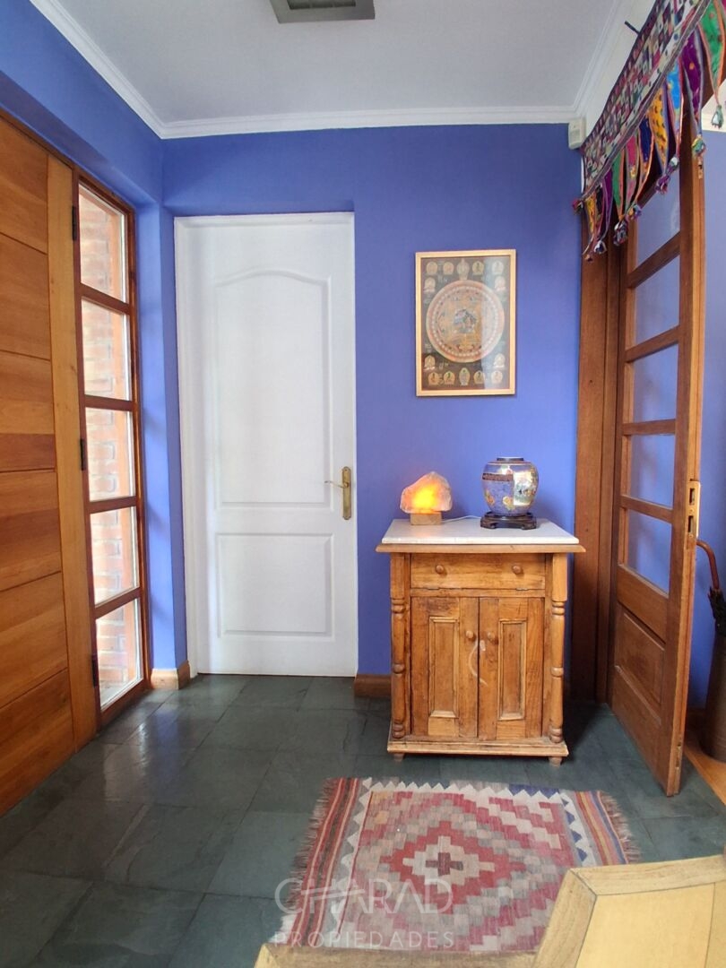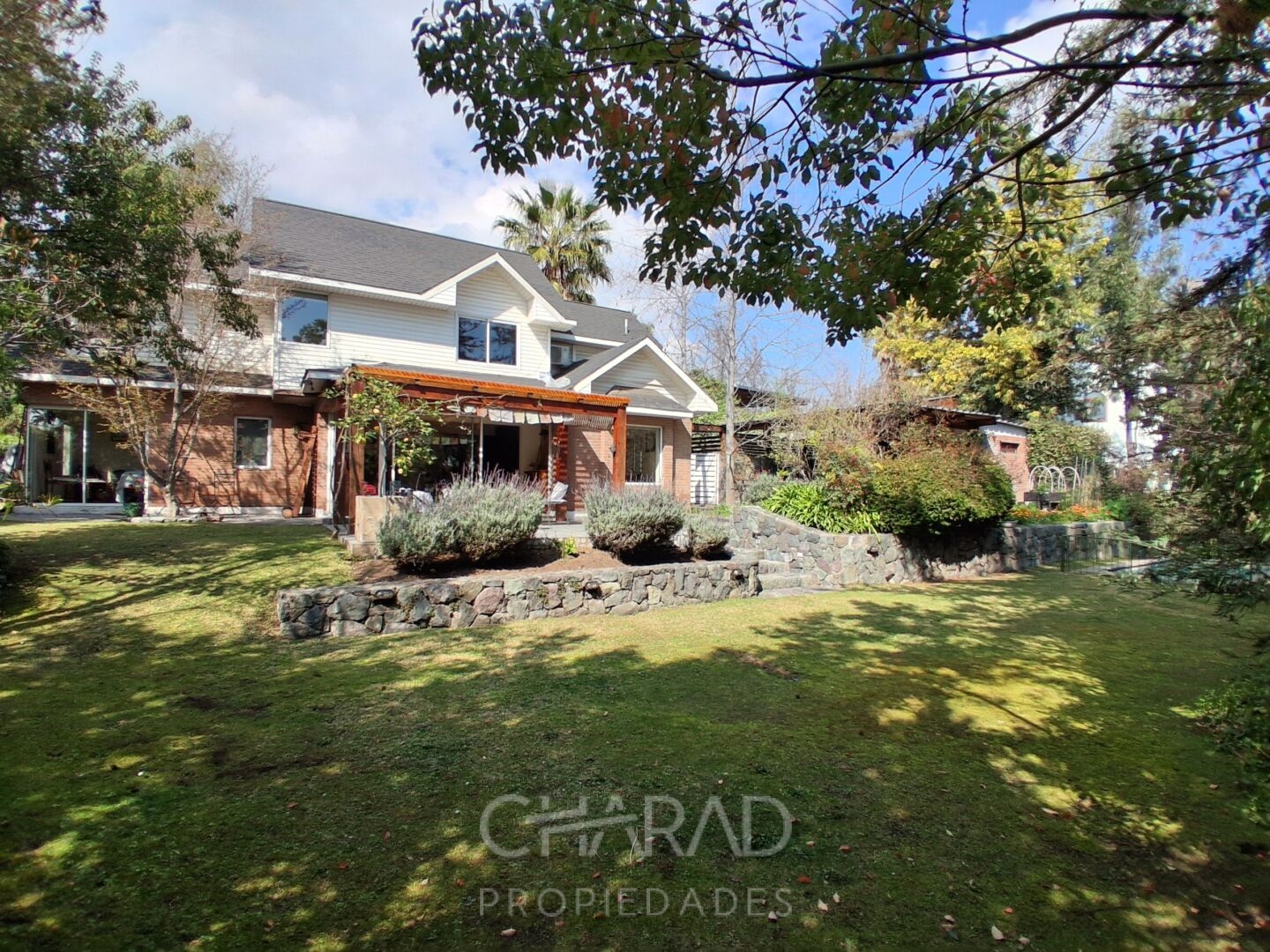 Exterior: Jardín formado, riego automático, terraza, quincho techado, bodega, piscina, huerta, estacionamientos.