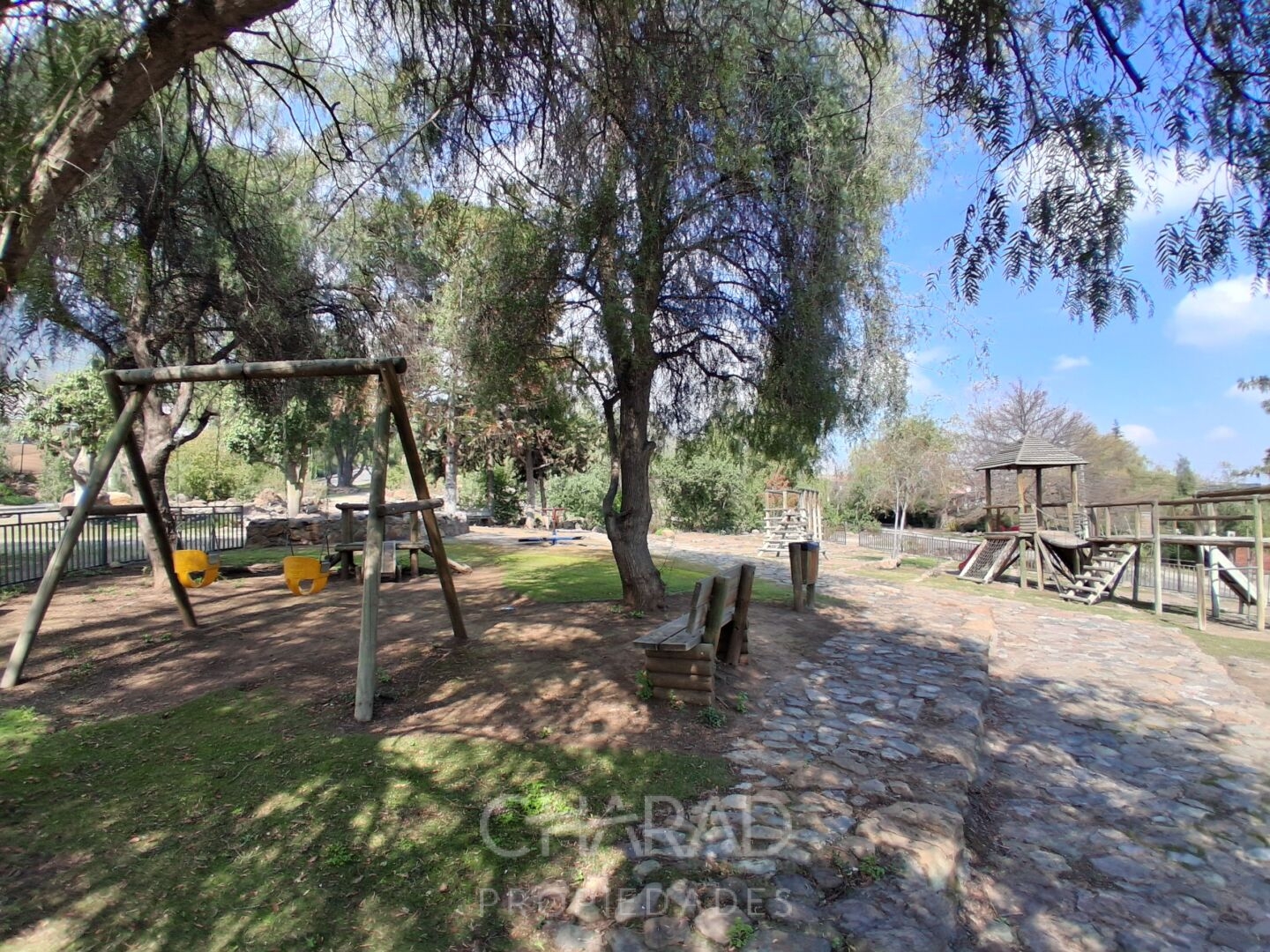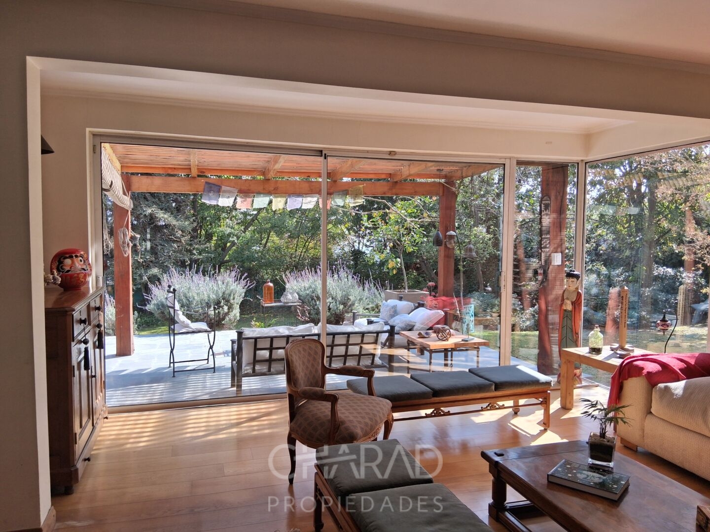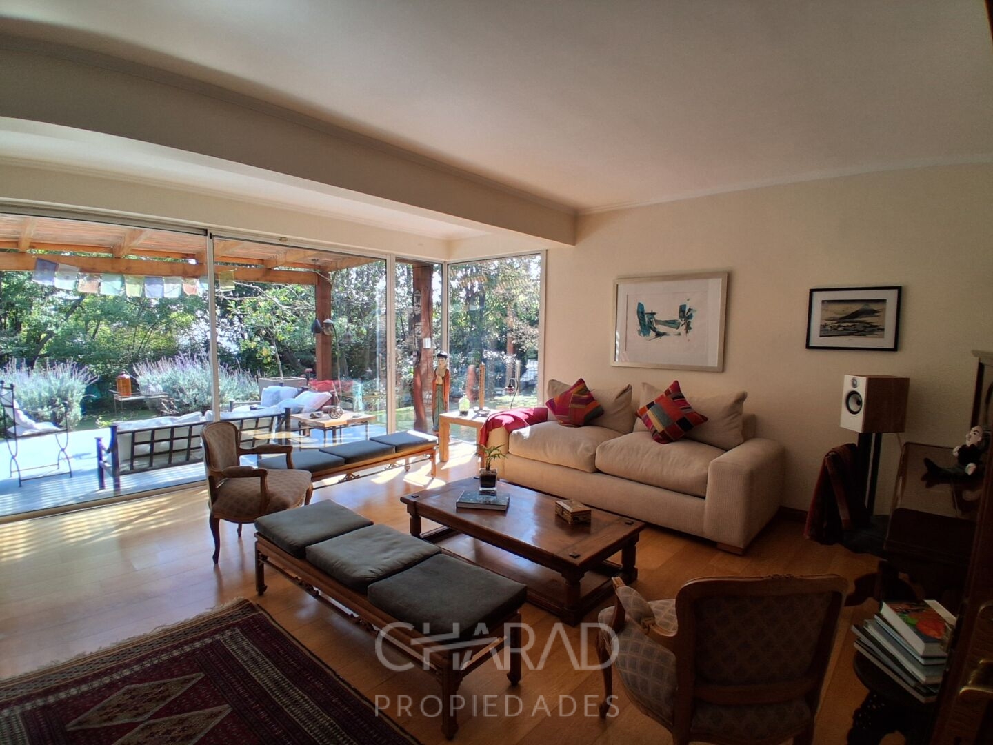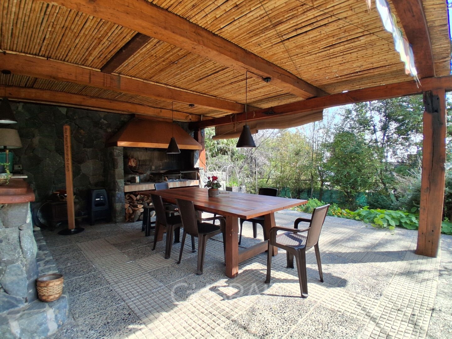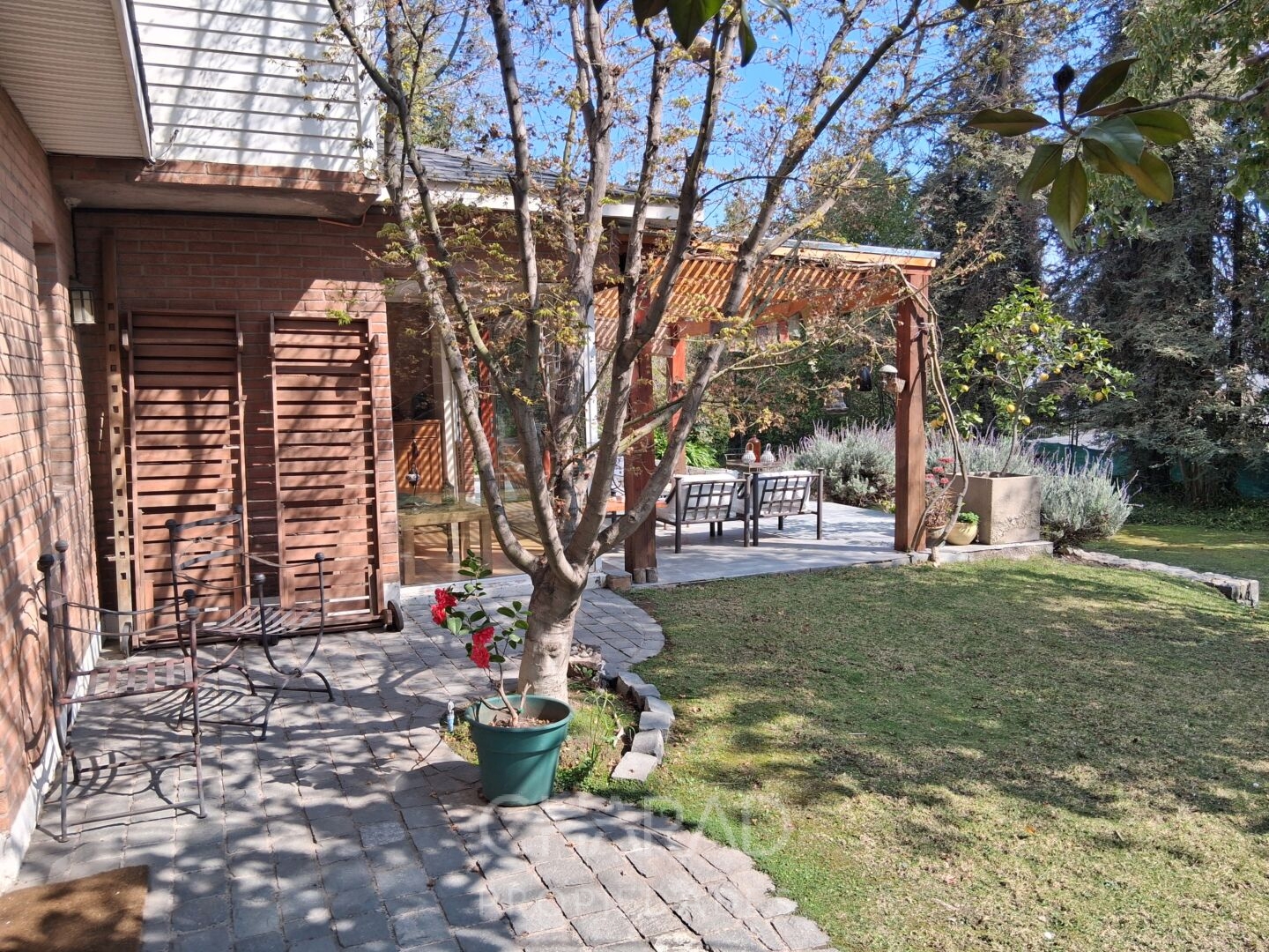 Exterior: Jardín formado, riego automático, terraza, quincho techado, bodega, piscina, huerta, estacionamientos.