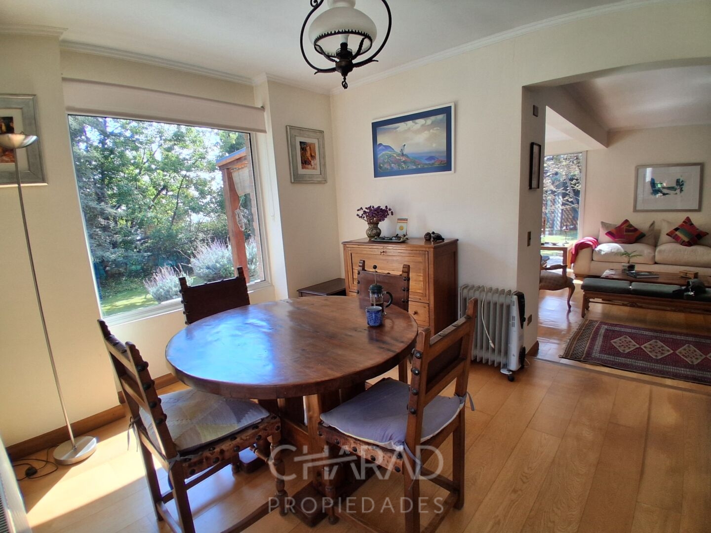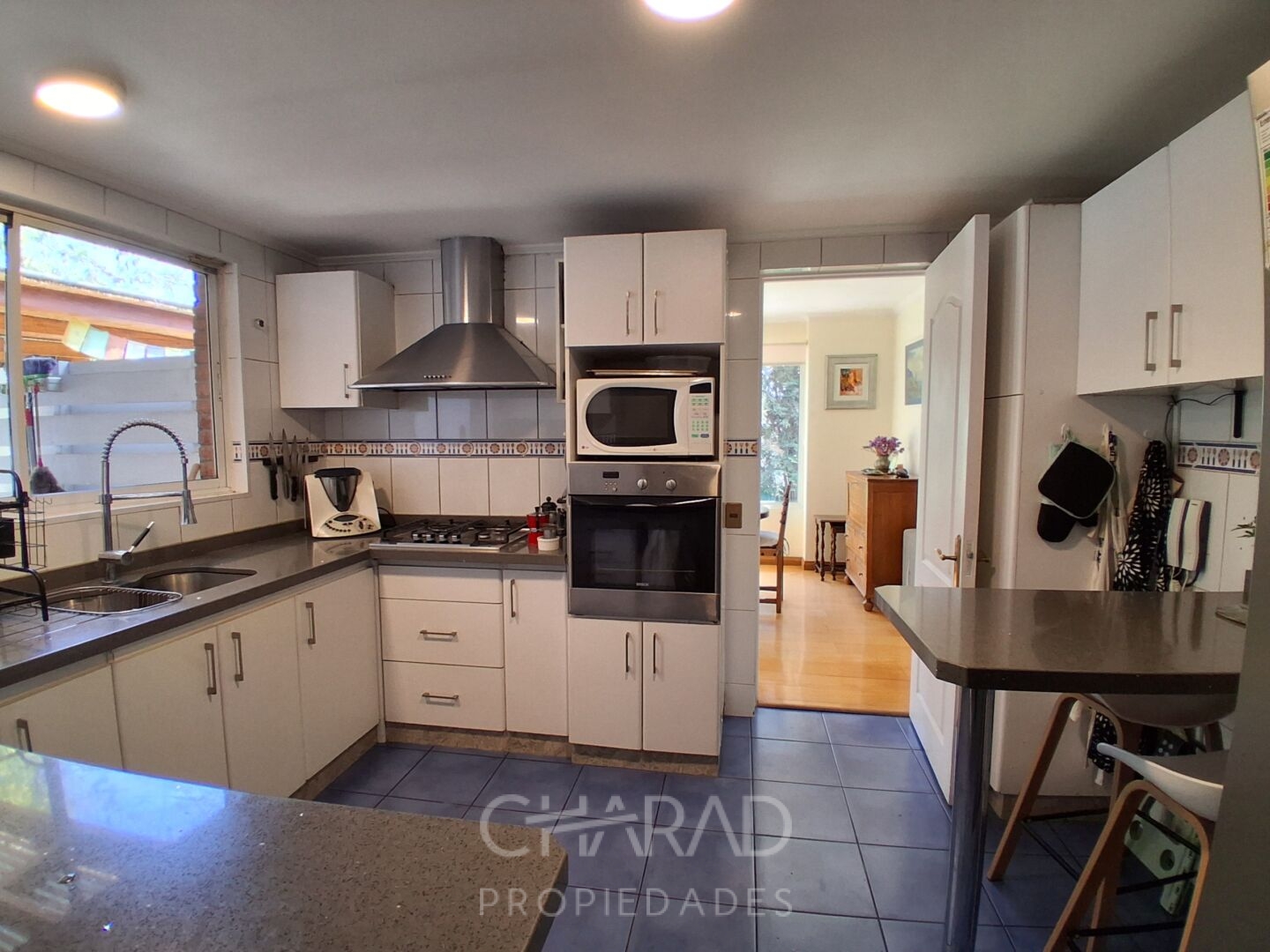 Hall de Entrada: Living-comedor semi separados en desnivel, cocina amoblada y equipada con comedor de diario, lavandería, pieza y baño de servicios.
