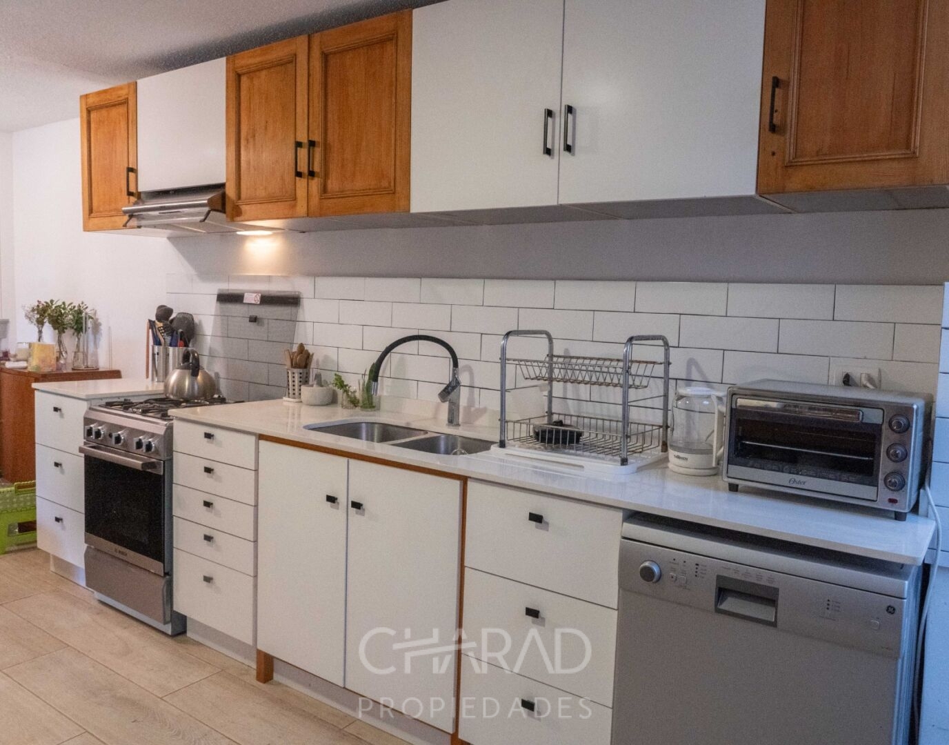 lavavajillas, cocina y campana, refrigerador y freezer independientes.